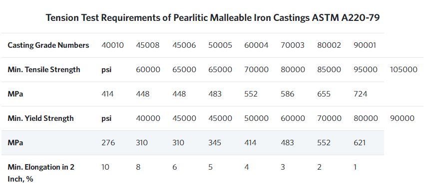 Pearlitic Malleable Iron: This type of malleable iron contains some combined carbon in various forms. It may be produced either by stopping the heat treatment of regular malleable iron during production before the combined carbon contained therein has all been transformed to graphite or by reheating regular malleable iron above the transformation range. Pearlitic malleable irons exhibit a wide range of properties and are used in place of steel castings or forgings or to replace malleable iron when a greater strength or wear resistance is required. Some forms are made rigid to resist deformation while others will undergo considerable deformation before breaking. This material has been used in axle housings, differential housings, camshafts, and crankshafts for automobiles; machine parts; ordnance equipment; and tools. Tension test requirements of pearlitic malleable iron castings called for in ASTM Specification A 220–79 are given in the accompanying table.