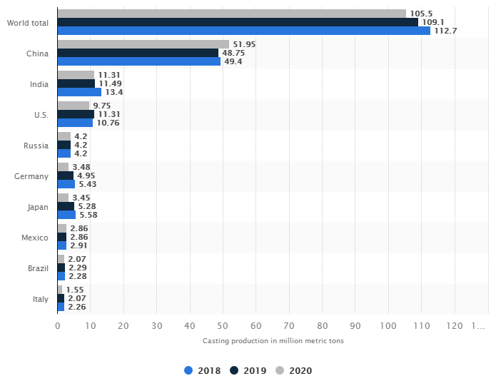 The world volume of casting production has fallen steadily by 6.4 percent since 2018, with a recorded production volume of 105.5 million metric tons in 2020. Despite this global decline, China's production has increased, maintaining the lead in 2020 with 51.95 million metric tons--nearly 49.2 percent of the world's production. India and the United States followed with a casting production of 11.31 and 9.75 million metric tons, respectively, that same year, with the U.S. showing a year-on-year decrease of 13.8 percent.