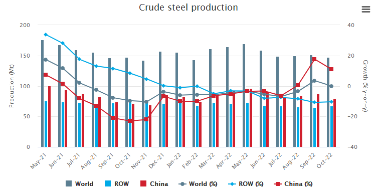 World crude steel production for the 64 countries reporting to the World Steel Association (worldsteel) was 147.3 million tonnes (Mt) in October 2022, a 0.0% change compared to October 2021.