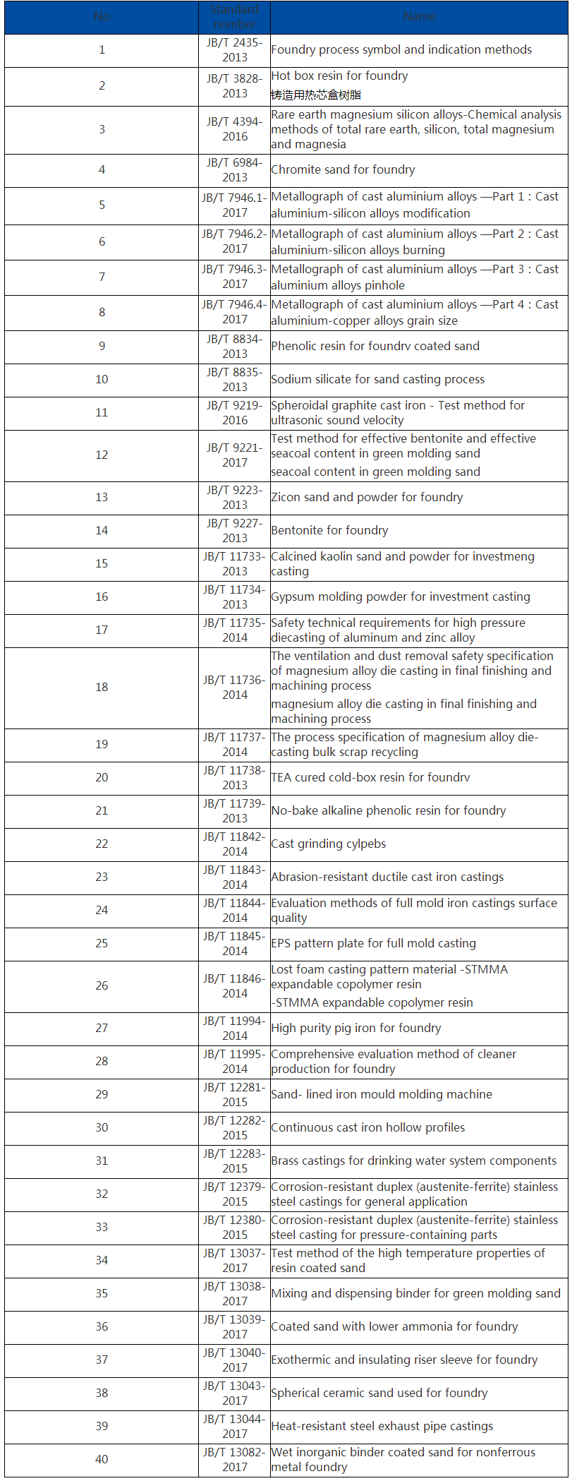 The National Foundry Standards Committee(SAC/TC 54) now conducts forty standards periodical review, organizes experts of technical committees and subcommittees, experts working in the foundry industry in reviewing these standards. Overview of forty standards, see table 1.