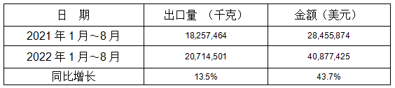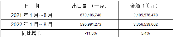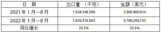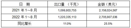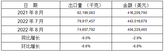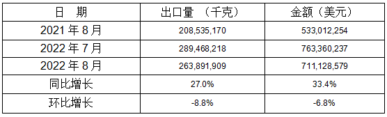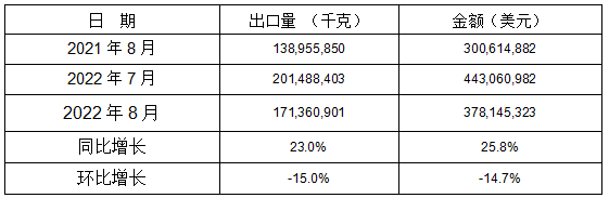 1-8月13个税号黑色铸件合计出口122万吨,同比增长11.0%。其中:8月份出口17.1万吨,同比增长23.0%,环比增长-15.0%,见表2和表3;