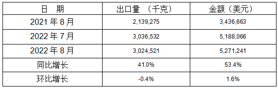 1-8月铸模及铸芯用粘合剂共计出口2.1万吨,同比增长13.5%。其中:8月份出口0.3万吨,同比增长41.0%,环比增长-0.4%,见表11和表12。